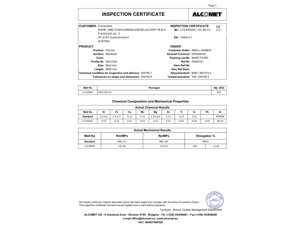 Je vyrobena z hliníkového plechu tloušťky 5 mm, šířky 80 mm a délky 1 180 mm.
